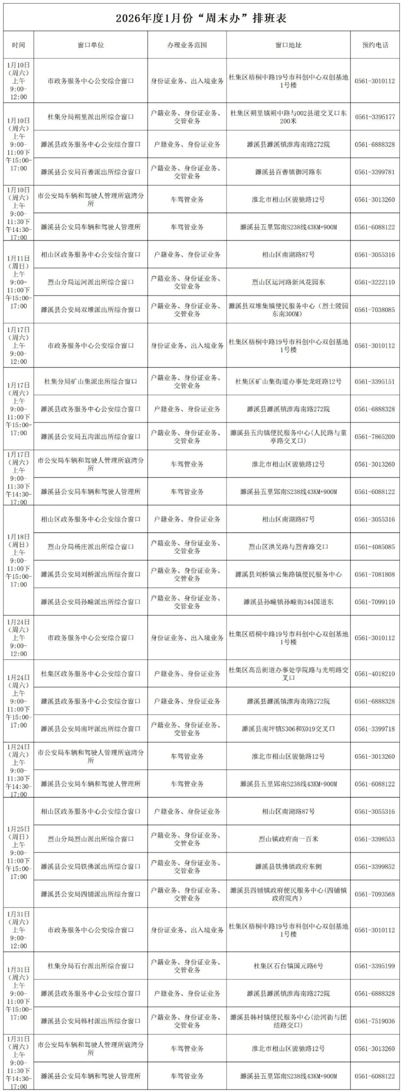 为进一步方便群众办理业务,有效解决群众工作时间“没空办”,休息时间“没处办” 难题,市公安局继续推出政务服务“周末办”“预约办”“错时办”,请有需要的市民朋友,关注全市公安政务服务窗口单位2026年1月“周末办”服务时间(可电话预约),快来了解一下吧!