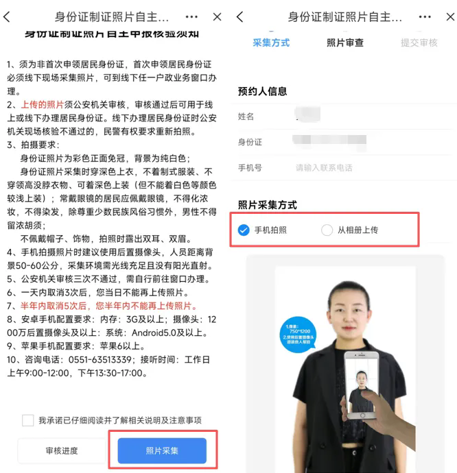 2.认真阅读办理须知后,点击“照片采集”,选择照片采集方式,提交符合要求的照片,按操作提示完成照片提交审核。