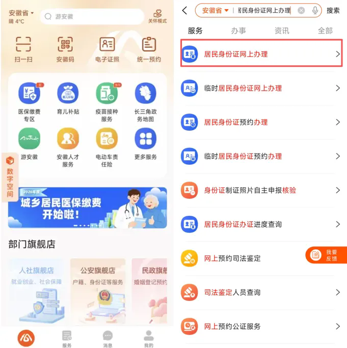 1.下载皖事通APP并注册登录,在首页搜索“居民身份证网上办理”。