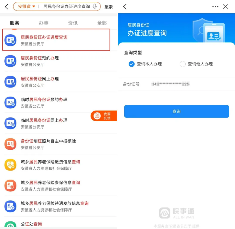 办证提交审核后,在首页搜索“居民身份证办证进度查询”,可查询本人或他人身份证办理进度。