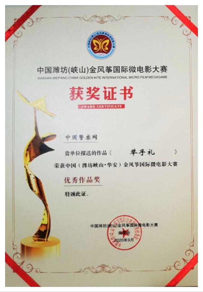 近日,濉溪县公安局原创微电影《举手礼》在2020第四届中国潍坊(峡山)金风筝国际微电影大赛中荣获“优秀作品奖”。