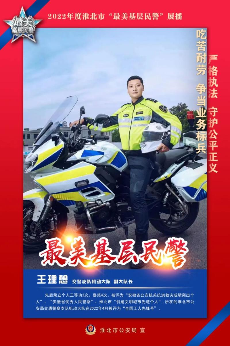 王理想同志现任淮北市公安局交警支队机动大队副大队长,三级警长。从警9年以来,他始终扎根一线,以忠诚赴使命,以行动践初心。先后荣立个人三等功2次、嘉奖4次。被评为“安徽省公安机关抗洪救灾成绩突出个人”、“安徽省优秀人民警察”、淮北市“创建文明城市先进个人”,所在的淮北市公安局交通警察支队机动大队在2022年4月被评为“全国工人先锋号”。