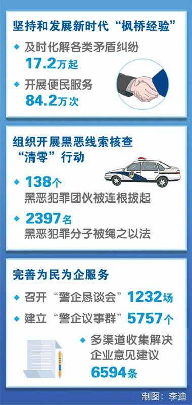 坚决护航经济发展。聚焦企业群众所需所盼,创新建立“民声呼应”涉公安事项闭环办理和全省公安系统“民有所呼、警必回应”工作机制,主动搭建“警企恳谈会”“警企直通车”等渠道问需求计,真正把服务做到企业群众心坎上。持续推进“安商护企创一流营商环境”活动,研究出台一系列利企惠企措施。严厉打击各类涉企违法犯罪,加大联合执法力度,让企业安心经营、放心发展。