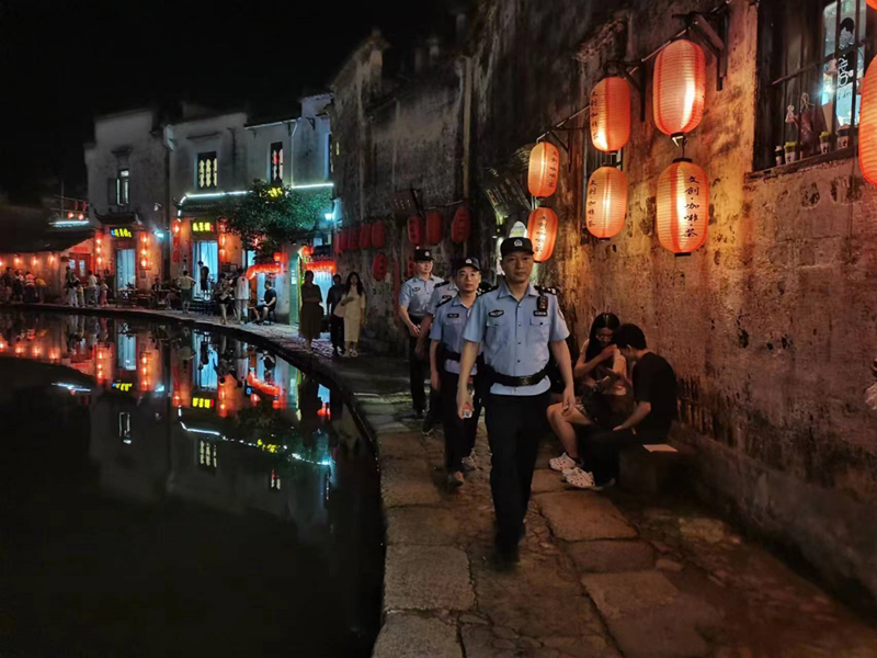 黟县公安局宏村派出所民警正在景区开展巡逻。陈辉平摄