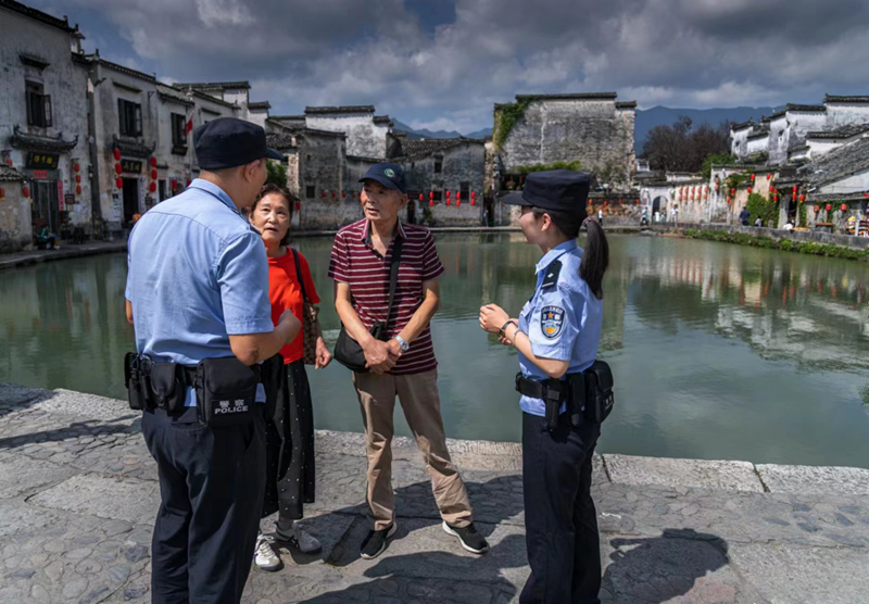 黟县公安局宏村派出所民警正在景区向游客开展安全宣传。程大亮摄