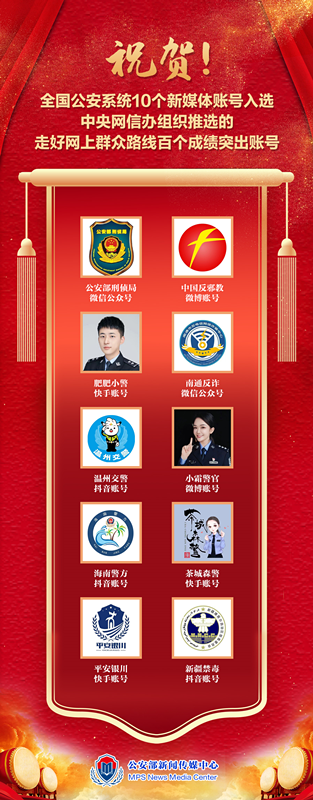 祝贺!全国公安系统10个新媒体账号入选中央网信办组织推选的走好网上群众路线百个成绩突出账号,其中安徽有两个账号入选,分别是“肥肥小警”快手账号和“小霜警官”微博账号!