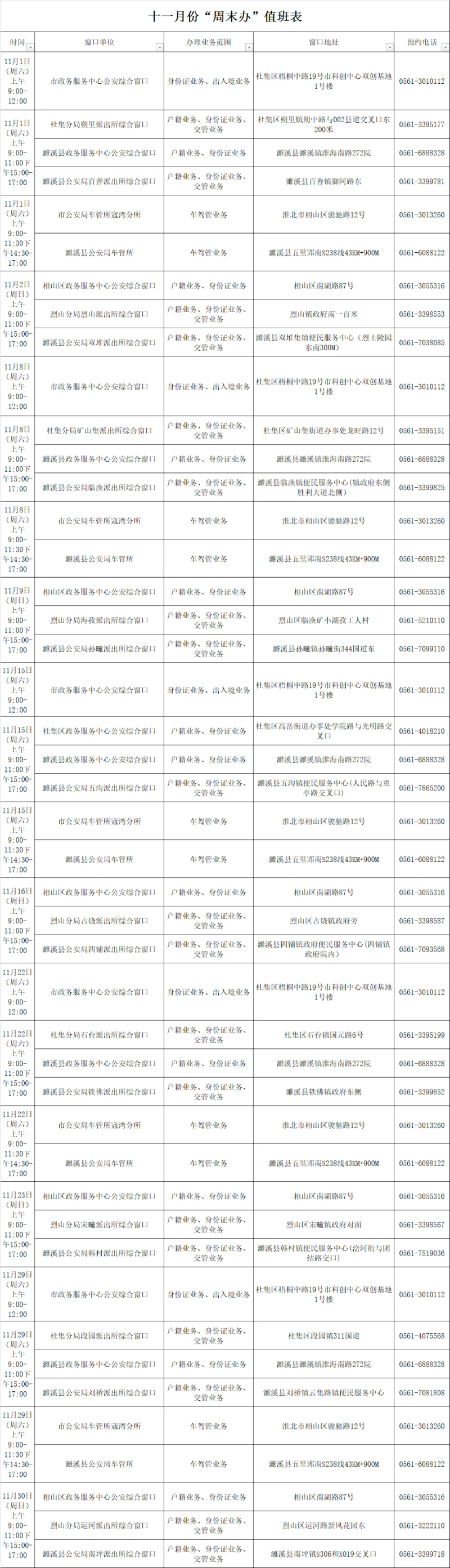 淮北公安政务11月份周末服务安排
