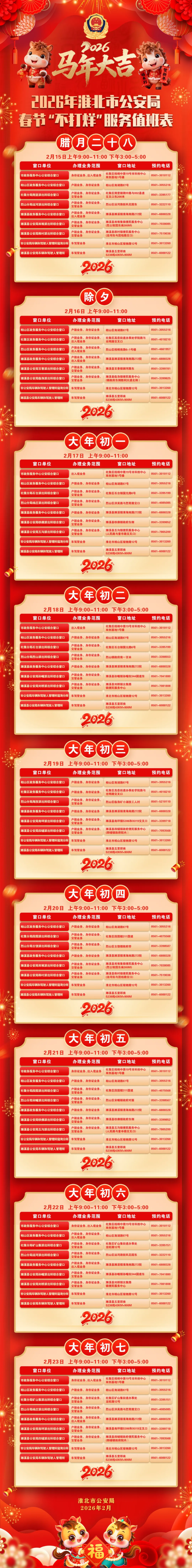 灵蛇辞旧岁、骏马踏春来,春节期间为满足人民群众办事需求,淮北公安在春节放假期间提供公安政务窗口“预约办”“不打烊”服务。记得收藏服务时间表按照日期就近到值班窗口办理业务,也可以提前电话咨询、预约。