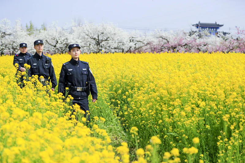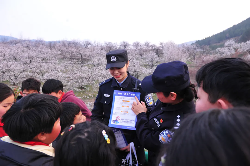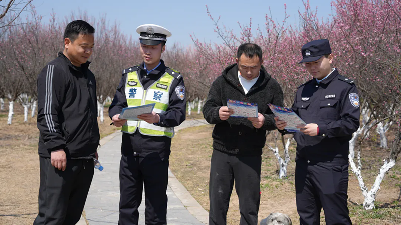 春意盎然的杏花林间,游人如织。民警辅警化身“宣传形象大使”,手持宣传单,摆放宣传展板、穿梭于赏花游人之间,开展反诈、反家暴、禁毒防毒、道路交通安全为主题的普法宣传,让游客在领略春光之美的同时,潜移默化地提升法治意识。