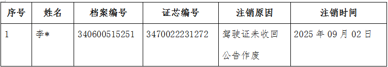 下列驾驶证已被淮北市公安局车辆和驾驶人管理所依法予以注销,其驾驶证未收回,现公告驾驶证作废。具体见附件。