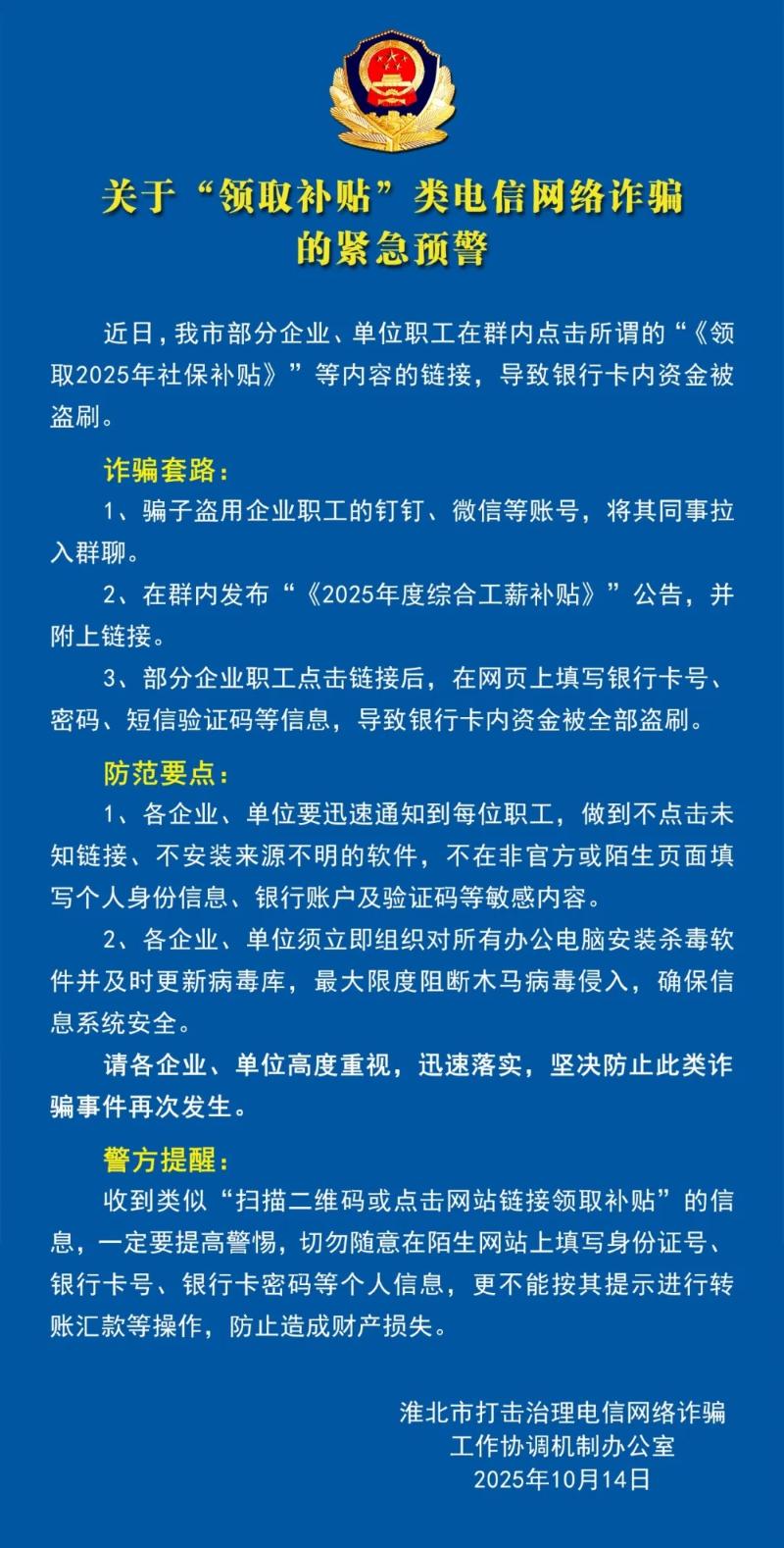 警方提示:关于“领取补贴”类电信网络诈骗的紧急预警